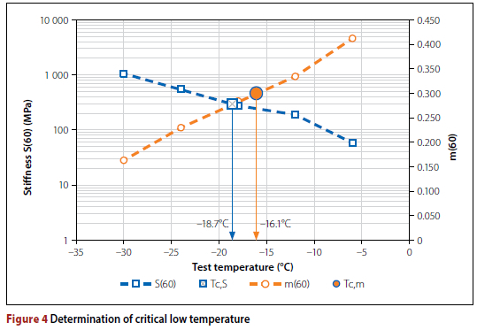 Accuracy of testing is very important; the dataset shown in Figure 4 is an example of a dataset that is below standard and was included to demonstrate the importance of accuracy. Data quality can be improved by duplicate tests. The S(60) versus temperature and m(60) versus temperature should be a smooth function. From inspection it can be deduced that the -12°C datapoint is clearly problematic. Accuracy can be improved by preparing samples at the same time and test within an acceptable timeframe to avoid secondary influences such as steric hardening, especially for BBR tests that are done at low temperatures. As mentioned already, critical temperatures must be determined through interpolation, not extrapolation.