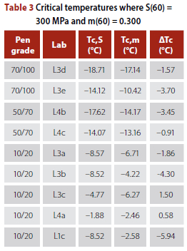 Critical temperatures for all tested bitumens are shown in Table 3. The test requirement ΔTc = Tc,S - Tc,m is shown in Table 3, although it is not required to determine the continuous low temperature of a bitumen.