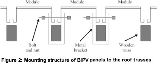 The longest side of the panels rest on roof trusses whose spacing was made equal to the width of the module. A U-shaped metal bracket, bolt and nut were used to fasten two adjacent modules, at three points, to the roof truss beam as shown in Figure 2.