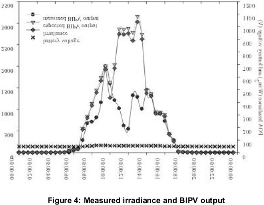 The average variation of solar irradiance and BIPV output on a typical clear day in December 2011 is shown in Figure 4. The measured output matches the expected peak output of the BIPV array from sunrise to 09:00 hours. At 09:00 hours, battery voltage reaches its maximum of 56 Vdc. After 09:00 hours, the charge controller changes its charging mode from 'bulk' to 'float' charging at a constant voltage of 52 Vdc.