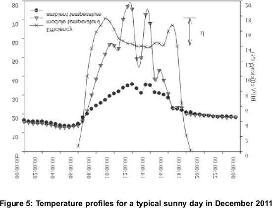 The temperature and BIPV efficiency variation throughout the day is shown in Figure 5. The maximum operating temperature of the array was found to be 77.1°C at 12:00 hours when ambient temperature was 35.7°C and solar irradiance was 953.4 W/m2. It is evident from Figures 4 and 5 that the BIPV operating temperature depends on ambient temperature and irradiance. The elevated back of module temperatures resulted in a decrease in efficiency of up to 20% between 09:00 and 16:30 hours.