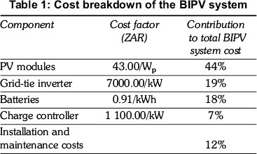 Table 1 shows the cost breakdown of the BIPV generator and its components. These values are based on supplier prices of 2008.
