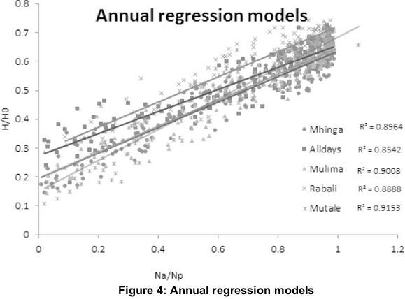 Overall, the determined annual regression coefficients for the Vhembe Region appear consistent with the reports such as for the locations: Toledo (Almorox et al., 2004) (where a = 0.2170 and b = 0.5453), Lesotho (Safari et al, 2009) (where a = 0.266 and b = 0.512), and Bulawayo (Gopinathan, 1988) (where a = 0.304 and b = 0.440). Moreover, Pereira (Pereira, 1988) has recommended general values of a and b to be 0.250 and 0.50 respectively, for any location and climate.