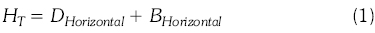 The total solar irradiance (HT) on a horizontal surface at ground is the sum of the sun's direct beam () (BHorizontal) and sky diffuse (DHorizontal) solar irradiance. That is: