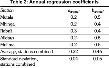The annual regression coefficients for all the sites have been determined by the linear regression curves to the data sets for the respective sites. The derived annual regression coefficients are given in Table 2. The table also shows the calculated linear regression coefficients for all stations combined as well as the respective standard deviations. The standard deviations suggest a combined uncertainty of a ± 20% and b ± 11%, which may be acceptable given the uncertainties of raw data. It follows that the annual average linear regression coefficients may be considered representative coefficients for the Vhembe Region. That is, the Angström-Prescott linear regression model for the Vhembe Region in the Limpopo Province may be represented as: