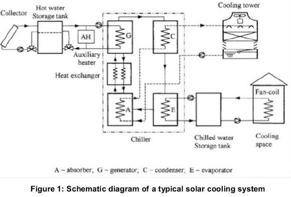 Solar cooling systems are generally composed of solar thermal collectors, a form of heat storage, a thermally driven cooling device, the distribution system, and a back-up system (Balaras et al., 2007).
