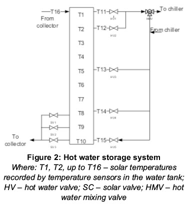 If the solar temperature (T) T16 is greater or equal to 85oC, the solar pump runs unless the average tank temperature is 93oC in which case the pump will stop. The pump will only start again if the average tank temperature exceeds 90oC. If the difference between the solar temperature and the temperature of the water coming out of the solar valve (SV) SV1 is greater than 3oC then SV1 opens. If the difference between the solar temperature and the temperature of the water coming out of SV2 is greater than 3oC and the difference of the temperature of the water coming out of SV1 and that coming out of SV2 is greater than 0oC, then SV2 opens. If the difference between the solar temperature and that of the water coming out of SV3 is greater than 3oC and the difference of the temperature of the water coming out of SV2 and that coming out of SV3 is greater than 0oC, then SV3 opens.