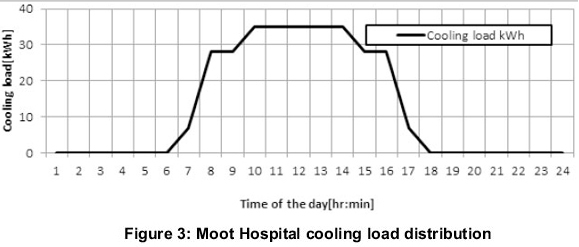 According to the design information provided by Voltas Technologies, this system was designed to provide the amount of cooling energy provided in Figure 3. The chiller was supposed to be switched on at 9:00 and provide an hourly average of 20% or 7kW of its nominal capacity, increasing to 80% or 28kW at 10:00 and 100% or 35kW at 12:00. It would continue providing 35kW of energy for five hours until 17:00, then 28kW for two hours until 19:00 when it would provide 7kW for an hour before being switched off. The absorption chiller is considered as a black box, a component that simply outputs chilled water when supplied with hot water. These design values were arbitrarily chosen as the amount of the building cooling load that the absorption cooling system was supposed to cover.