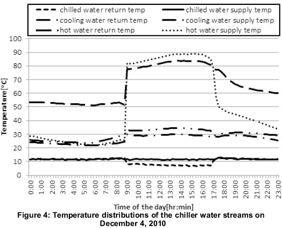The temperature distributions for the input and output streams into the absorption chiller on December 4 2010 are shown in Figure 4. The chiller is on a time schedule and switches on at 9:00. Before 9:00 the recorded chiller hot water inlet temperature is about 25oC since the chiller will not be drawing any water from the hot storage tank. At 9:00, the chiller starts getting water from the tank, so the inlet water temperature rises from 25.1oC to 82oC. This rapid rise at the chiller inlet and outlet is as a result of the three way valve opening to allow water into the chiller when the chiller is switched on. This temperature gradually increases to a maximum of 88.8oC at 15:00 as incident solar energy increases. The cooling effect starts to be produced at 9:00 when the chiller is switched on, hence the marked decrease in the chilled water temperature from 12.5oC to 8.4oC. This temperature eventually stabilizes and reaches a lowest temperature of 6.8oC at 13:45 as seen by the almost flat line on the graph between 9:00 and 17:00.