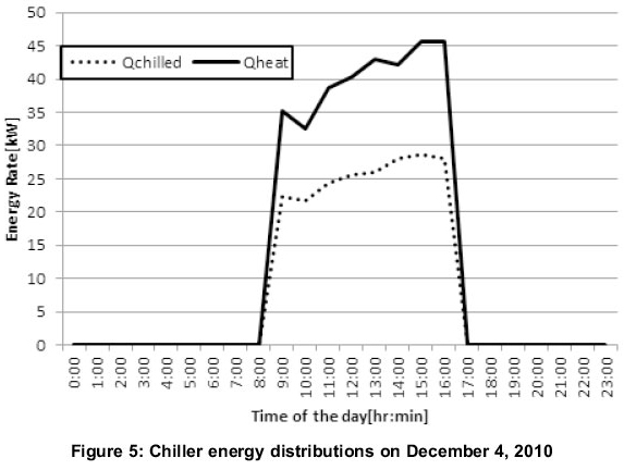 The distribution for energy produced is shown in Figure 5. The system starts producing cooling ener- gy at 9:00 when it is switched on since the hot water supply temperature is 82oC at that time. It produces 22.2kW from 35.2kW of heat supplied by the hot water, giving a COP of 0.63. This COP value remains almost constant throughout the day, indicating a steady supply of hot water from the storage tank. The maximum values of cooling energy produced and heat energy supplied are 28.6 and 45.7 respectively.