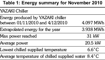 The chiller is energized by water temperature between 70oC and 95oC, but the system control strategy states that the chiller will only start producing cooling energy if the hot water temperature being fed into the generator exceeds 81oC. In this study, the system performance values at Moot Hospital were recorded at 15 minute intervals and there are 3307 data points from 13:00 on November 1st to 18:00 on December 4th. Of these recorded values, 846 of them, representing 25.5% of the time, were above 70oC, suggesting that the chiller could have run for 25.5% of the time if required. The generator inlet temperature exceeds the threshold value of 81oC 494times, which represents 14.9% of the time. This results in part load behaviour for the chiller and the amount of cooling energy produced is presented in Table 1.