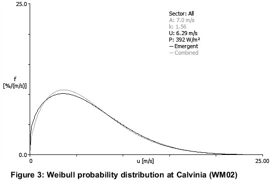 Two locations on the west coast of South Africa within the WASA domain (Figure 1) were selected for analysis in the latest version (11) of WAsP. Their Weibull pdfs are shown in Figures 2 and 3.Observed wind data collected close to these areas were used in the study to model the current and projected situation regarding energy production from wind. This part of the method is similar to that of Hocaoglu and Kurban, (2009), where data measured at a site was employed to estimate a wind resource at that exact same site. Projected wind speeds were determined by modifying observed wind data according to projected changes in wind speeds.