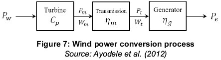 When assessing an area's wind resource, one must, therefore, consider the influence of wind turbines themselves on the amount of electrical energy that can be extracted from the kinetic energy available in the wind. Wind turbine generator efficiency and mechanical transmission efficiency, for instance, also play a role in the electrical power output of a particular turbine (Ayodele et al., 2012).