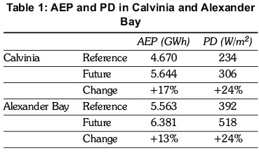 Table 1 shows the overall AEP and PD of the two locations under current and projected conditions, as produced by WAsP. Relative changes in the two variables are also indicated.