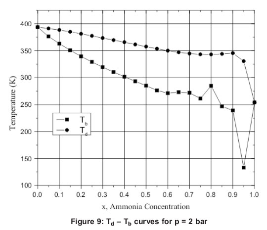 There are certain combinations of pressure and temperature at which the mixture is not in equilibrium condition. This occurs when at the given pressure, the mixture temperature lies between the dew point temperature and the saturated temperature of pure water (Tsat2). In this case, ammonia is in the superheated vapour form and water exists in the metastable vapour form. Another situation occurs when at the given pressure, the temperature lies between the boiling point and the saturation temperature of pure ammonia (Tsat1). Here ammonia is assumed to be in the metastable liquid state.
