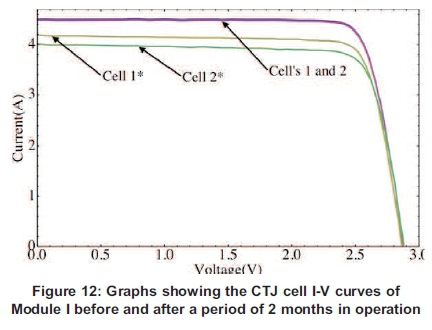 In order to assess the reliability and performance of Module I, the performance of single cells within the module were monitored over a 2 month period. Figure 12 shows the initial I-V characteristics, under concentration, of 2 individual cells in an optically aligned system before and after (shown with*) the 2-month operational period. Table 3 summarizes the parameters of the CTJ cells before and after an operational period.