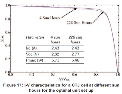 It is noticed from the normalized curves that there is little deviation in the shape of the I-V curves from 4 to 228 sun-hours. The small deviation observed from the curve at 4 sun-hours may be attributed to the influence of the optical system, such as soiling of the refractive secondary. Although the operational mode for this cell was to have an optimal optical configuration, the optics may not optimal. There may be areas across the cell that have non-uniform illumination. This non-uniformity distribution of irradiance may cause the shunt slope of the I-V curve to increase due to the effect of localized photo-current mismatch which may promote degradation. The table within the graph indicated that there is a small change in the normalized Isc (to 850 W.m-2.) This small variation can also be attributed to the optical illumination pattern. As a result of this illumination pattern, certain areas within the CTJ cell may experience a form of cell damage/ or the start of defects within device to occur.
