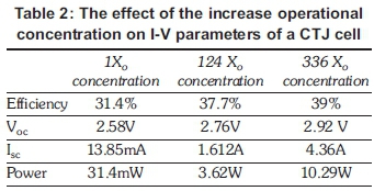 The increased photon flux on the CTJ results in increased photocurrent density and hence, will lead to an increased power output from the CTJ (Kost et al., 2014; Chong & Siaw, 2008; Rumyantsevm et al., 1997).