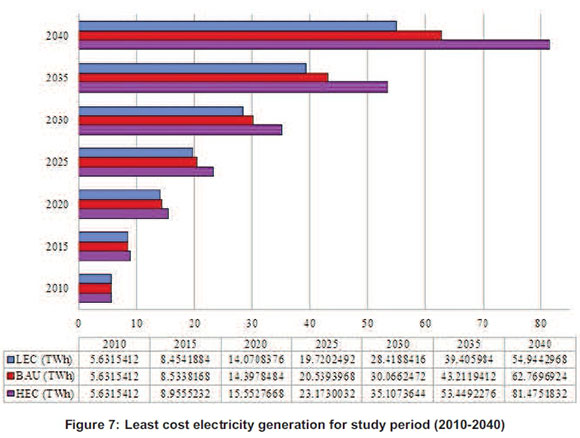 Summarized least cost total electricity generation for each scenario are as shown in Figure 7 and the least-cost electricity generation supply options results by technology in Table 3. BAU scenario least cost electricity generation expanded from 5 632 GWh in 2010 to 62 770 GWh in 2040. The expansion is equivalent to an annual growth rate of 8.4% as compared to 7.9% and 9.3% for the LEC and HEC scenarios respectively. The base year proportions in the generation mix include hydro (66.7%), NG (28.9%), biomass (2.5%) and HFO (2%).