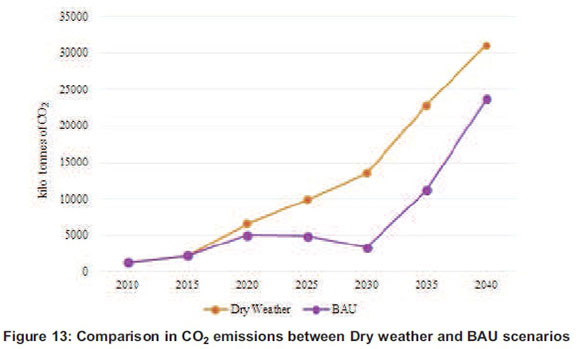 Experience has shown weather conditions affect electricity generation capacity causing outages and rationing (Loisulie, 2010; MEM, 2013b). The alternative dry weather scenario was formulated to analyse electricity system behaviour under uncertain weather conditions. All modelling inputs of a dry weather scenario remain the same as in the BAU scenario except for the imposed generation's constraints of hydropower to 20% of the total generations in the period 2020-2040. The least-cost results as shown in Table 7 shows the generations will shift to coal and NG power plants at approximately 42.8% and 30.2% respectively. The capacity additions for coal power plants will expand to 9 772 MW as compared to 6 040 MW in the BAU scenario. Because of imposed hydropower constraints, the CO2 emission will increase to 86938.67-kilo tonnes of CO2 as compared to 51296.6-kilo tonnes of CO2in the BAU scenario. Based on MESSAGE modelling results, if the country chooses to implement measures because of dry weather conditions, more usage of coal and NG as primary energy supplies will be the least cost option. The additional capacity in terms of coal and NG power plants to replace hydropower plants would decrease both the risks of a dry weather condition and energy security uncertainties. However, the weaknesses of coal and NG development into a dry weather scenario are the higher CO2 emissions as compared to the BAU scenario as depicted in Figure 13. The capital investment cost of the dry weather scenario will require less than 535.52 million US$ as compared to capital investment in the BAU scenario. Less capital investment cost in the dry weather scenario is due to lower capital investment cost and shorter construction time of coal coal-fired and NG power plants. Despite hydro power plant lower operation and maintenance costs, coupled with zero fuel consumption for final electricity generation, they have higher capital investment costs and longer construction life (Sharma, 2010).