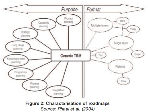 Phaal and Muller (2009) point out that the technology roadmap (TRM) is a dynamic or systems framework that provides a coherent and holistic structure, which can be mapped, and thus providing easy communication (see Figure 3). Roadmaps are, however, not limited to the format represented in Figure 3. Typical formats include: multiple layers; bars; network diagrams; and flow charts. Other formats also include: graphs, tables, pictorial presentations, and texts (Saritas and Aylen, 2010). The type of format chosen depends on the purpose of the roadmapping as shown in Figure 2. However, text formats have been used relatively less than the visual formats, which are much easier to communicate and understand. The number of layers that can be utilised in a roadmapping is customised based on the type of roadmap (firm, industry, sector, technology, and so forth) and the type of innovation (Kamtsiou, 2014).