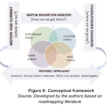The conceptual framework developed for this paper (Figure 8) is based on the roadmapping literature analysis. The key references that informed the development of the framework are: (i) Phaal et al. (2004) with regards to the phases in technology roadmapping; (ii) Saritas and Aylen (2010) with regards to methods that can be utilised in the data and analysis phase; (iii) Konnola (2007) with regards to systems of innovation theory, in order to inform migration analysis; and (iv) Huang et al. (2014) in informing the context of gap and migration analysis, which should entail a national context for target technology, the market and industry of the target technology, and impacts of the technology.