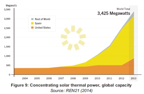 Globally, the market for solar thermal power continued to grow in 2013 after record growth in 2012. According to REN21 (2014), the total global capacity increased by nearly 0.9 GW, up 36%, to more than 3.4 GW as shown in Figure 9.