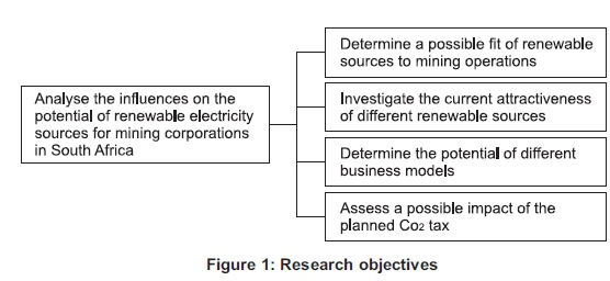 As Figure 1 shows, the investigation, summarised in the paper, looks at how renewable sources could fit into the electricity usage patterns of mining operations, the technological attractiveness of different renewable and current sources, the most beneficial business model is investigated, and possible impacts of the CO2 tax. No previous study combining all the macroeconomic elements that influence the project realisation of renewable electricity projects with mining corporations in South Africa could be found through a literature review. Three papers - by Boyse et al. (2014), Gets and Mhlanga (2013), and Brodsky et al. (2013) - do, however, cover some of the elements.