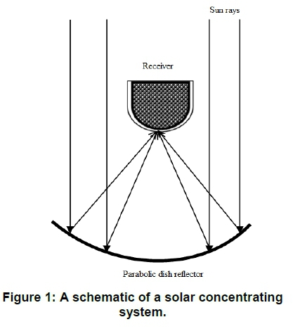 Figure 1 shows a schematic diagram of a solar concentrating system. It consists of rays emitted by the sun, a parabolic dish as the reflector and a receiver placed at the focal point of the reflector. Sun rays hitting the aperture of the parabolic dish concentrator are reflected onto an absorber/receiver placed at focus of the reflector. The rays are assumed to be parallel to the parabola axis.