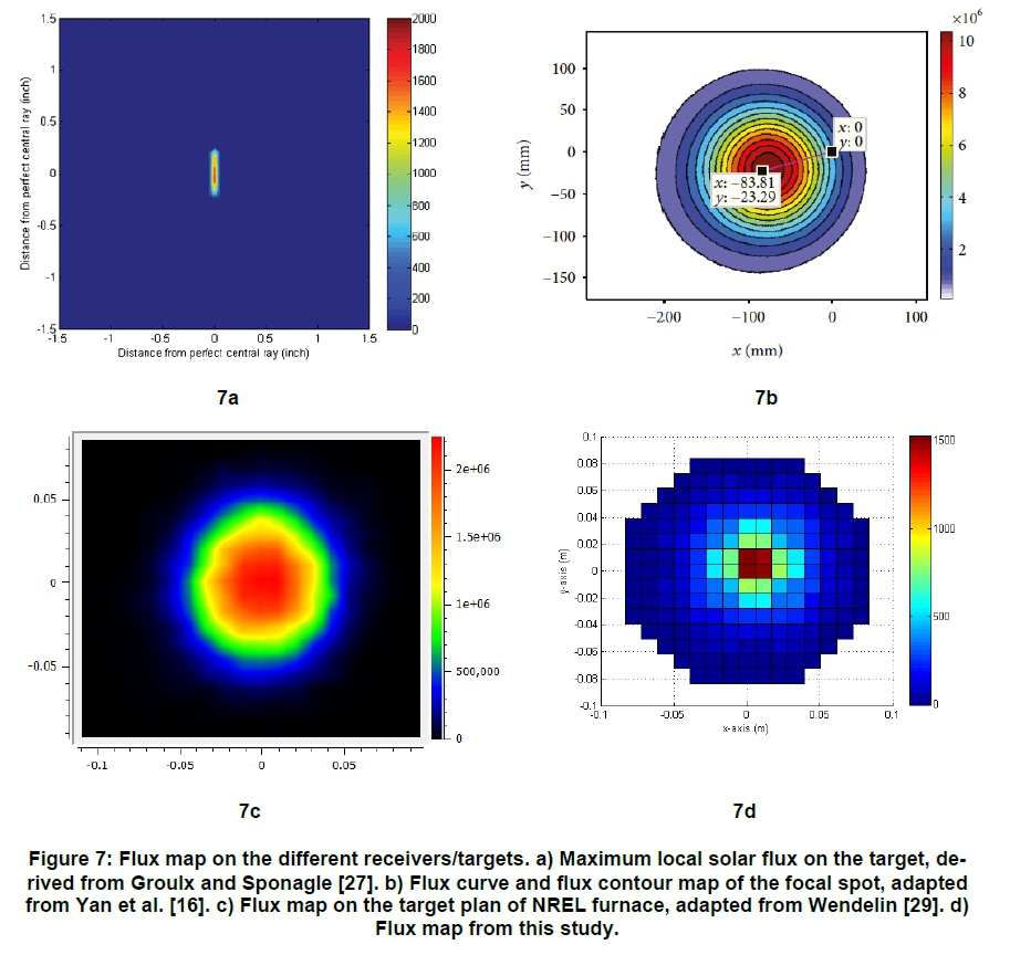 Figure 7 presents images produced on the absorber by various authors compared with the results from this study. It is observed that for all the images formed (Figure 7a-d); elongated images centred on the focus were formed. There was an overall agreement that the flux distribution spread around the focal point, but there were observed discrepancies in the intensities and image shapes/sizes. This was attributed to the fact that each study used different number of rays and the tracer involved different geometries.