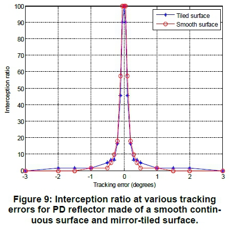 Figure 9 shows the impact of tracking errors on the interception ratio for PD concentrators with smooth continuous surface and mirror-tiled surface. A flat dish absorber of diameter 0.2 m was used. For a very small misalignment, for example at approximately 0.2°, the impact of the tracking error on the interception ratio was minimal, but as the tracking error increased there was a sudden decrease in the interception ratio. At a tracking error of +0.5 the interception ratio suddenly fell below 10%. On the other hand, the reflector with mirror-tiled surface was observed to tolerate the tracking errors up to +0.1 although with very low percentage of rays reaching the absorber. A similar observation has been made by Nydal [26] and Madessa [28], where parabolic dish reflectors with mirror-tiled surfaces are less sensitive to tracking errors.