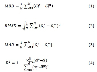 where Gf is the satellite-retrieved irradiance value at the ithtime point and G™ is the ground-based solar radiation value for that timestamp; N is the total number of points considered in the period of time analysed (year or month); and Gmis the average ground-based solar radiation value during the considered time.
