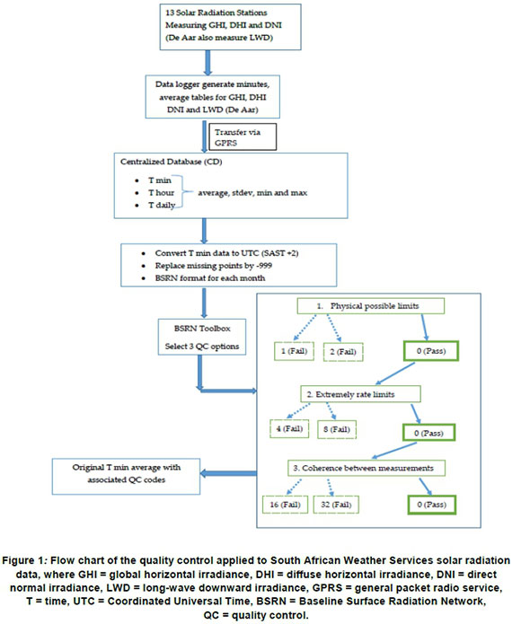 Knowledge of the local solar radiation arriving at the surface of Earth is very important for many different applications, such as crop growth models, architectural designs, planning, designing and sizing of solar energy systems [1, 2, 3]. To be successful in these applications, solar radiation measurements are required at strategic sites [1]. Historically, solar radiation data has been measured and recorded by the national meteorological services around the world [4]. Until recently, the South African Weather Service (SAWS) has been the primary source of ground-based solar radiation data in South Africa [5, 6]. The old solar radiometric network, which was operational from 1957 to 1997, collapsed because of technical difficulties and lack of maintenance [5, 7]. Owing to the rapid development of solar-based renewable energy technologies and projects, the demand for reliable and accurate data for site-specific solar resource assessment has increased [4]. Quality control (QC) may be a tedious process and, as a result, most users are keen to use data directly from meteorological services with confidence without performing an additional and fine data check [8]. To this end, in 2013, the SAWS re-established the national solar radio-metric network, comprising thirteen new stations within the country's six climatic zones [9]. These stations are equipped with robust and reliable instruments suitable for Baseline Surface Radiation Network (BSRN) solar radiation measurements [10]. Climatic zones are regions with similar climatic conditions [11] and, according to Conradie [9], they were established to classify different areas based on their maximum energy demand and maximum energy consumption. Where each radio-metric station is located, there is an automatic weather station (AWS) measuring hourly temperature, rainfall, pressure, humidity, wind speed and wind direction to provide auxiliary meteorological parameters. Measurements of solar radiation are more susceptible to errors than other meteorological parameters [12]. According to Urraca et al. [12], there are two major sources of these errors related to ground-based solar radiation measurements: equipment and operational errors. Equipment errors are inherent to the type and construction of the sensors used in the measuring campaign [4, 8]. Solar measuring sensors produce electric current when reacting with radiation, which is converted into measurement of solar radiation. Solar radiation measurement instruments are also prone to change in sensitivity, thermal offsets, spectral effects, geometry and the environment [4]. On the other hand, operational errors are independent of the type of sensor, and involve different factors such as shading by nearby objects or dust covering the dome of the sensor, incorrect levelling, station shut-downs, and electric fields near cables or a malfunction in the data-logger. Careful selection of the place to install the station, as well as a regular maintenance, can ameliorate most of these operational errors. Applying a QC procedure becomes an essential step before using ground-based datasets [4, 8] to identify and quantify all the different types of errors in the measurements of solar radiation. According to Huld et al. [13], accurate and reliable solar radiation measurements provide investment-grade bankable solar radiation data to the solar energy industry, project developers, decision makers in financing and policy-making institutions, and the scientific community. Accurate ground-based solar radiation data is also important for the improvement and validation of satellite-derived solar radiation data and scientific models.