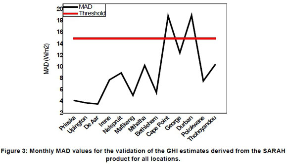 Prieska, Upington, De Aar, Irene, Mafikeng, Bethlehem, Polokwane (stations located in the arid climatic regions, cold interior and temperature interior) reached an optimal threshold with a MAD of less than 8 Wm-2 when compared to the SARAH GHI. On the other hand, Nelspruit (hot interior) reached a target accuracy threshold with MAD less than 10 Wm-2, while Thohoyandou (hot interior), George (temperature coastal) and Mthatha (Subtropical coastal) meet the validation threshold with MAD less than 15 Wm-2.