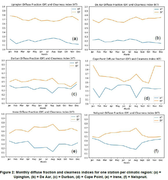 The clearness index and diffuse fraction shown in Figure 4 depict higher values (near 1) of clearness index, implying a clear sky and calm atmosphere. In case of Upington and De Aar, clearness index averages were >0.6 throughout the year. The diffuse fraction of solar radiation was also calculated for all locations and found to vary from 0 to 1. Higher values indicate more aerosols and clouds. The values for diffuse fraction for Upington and De Aar were always <0.3 in all months, indicating suitability of the locations for solar energy prospecting.