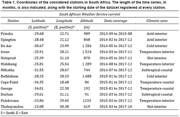 The datasets used in this study consist of ground measurements registered at thirteen stations in South Africa, owned and maintained by the SAWS. They are evenly distributed in six different climatic regions [11] over an area bounded by latitudes 23° to 34° south and longitudes 18° to 31° east, Figure 1. The elevation of the stations ranges from 80 m to almost 1700 m, as described in Table 1.