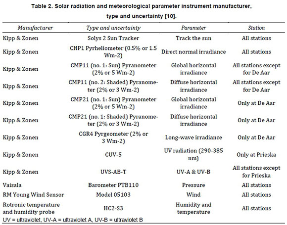 Table 2 provides information on the manufacturer and type of instruments used at the measurement stations. De Aar, located in the Northern Cape, is a BSRN station utilising two ventilated CMP21 pyranometers by Kipp & Zonen, which are rated in the highest possible International Organization for Standardization pyranometer performance category. The ventilation units keep the py-ranometer's domes clean from frost and water. Periodical maintenance procedures are applied to the various instruments to satisfy the BSRN quality requirements. The ground-based solar radiation database contains one-minute values of all the measured parameters at each station.