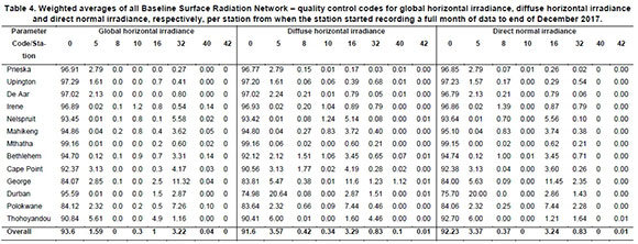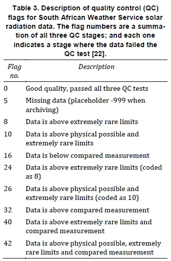 In the present study, the BSRN QC procedures were applied to the solar radiation data within the SAWS radiometric network, with data coverage from September 2013 to December 2017.