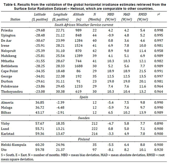solar radiometric stations (Table 1), were subjected to quality check procedures based on BSRN QC standards [22, 23, 24] before the validation was performed. Only the data that passed the first two quality check tests (physically possible limits and extremely rare limits) was used in the validation. Files containing missing values and the data that did not pass the first two BSRN QC tests were flagged and later replaced by not a number (NaN) before that timestamp was considered for the validation [22, 23, 24]. Moreover, the minute values were averaged to 15 minutes and then four slots of 15-minute averages were averaged to get hourly mean values [23, 24]. Furthermore, all night values, values between sunset (20:00) and sunrise (05:00) based on South African standard time, i.e., when the solar zenith angle is less than 90°, were replaced by 0. Hourly mean values were then averaged to get daily mean values and, subsequently, monthly mean values calculated from the daily mean values.