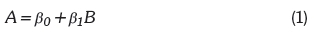where ß0and ß1are the coefficients of regression (constant and gradient of the linear relationship respectively, A is the dependent variable (output variable), and B is the predictor variable being investigated (respective input variable).
