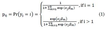 To estimate coefficients and for statistical specification on rural households for the discretely unordered cooking energy choices for various meals, a multinomial logit (MNL) model (Greene, 2012) was adopted. The model was chosen over the available alternatives because of its flexibility, computational efficiency and ability to allow simple behavioral interpretation of the parameters (McFadden et al. 1976). The MNL likelihood function does not require numerical integration and almost always converges to a global optimum (Dow and Endersby, 2004), making it stable. The MNL model assumes that if there are k categorical outcomes without loss of generality, the base outcome will be 1. The probability that the response for the jth observation is equal to the ith outcome is as shown in Equation 1.