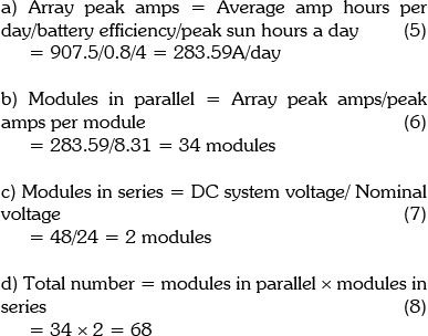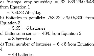 b) Batteries in parallel = Average amp hours per day χ days of autonomy/discharge limit/battery capacity