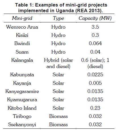 The development of mini-grids in areas remote from the national grid can increase electricity access in the country (Weston et al. 2016). Since 2000, Uganda has been implementing rural electrification projects, mainly hydropower, solar, biomass hybrid of solar and diesel projects as shown in Table 1.