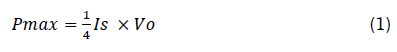 The maximum power is given as a function of open circuit voltage and short circuit current in Equation 1 (Lashin et al., 2020).
