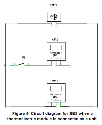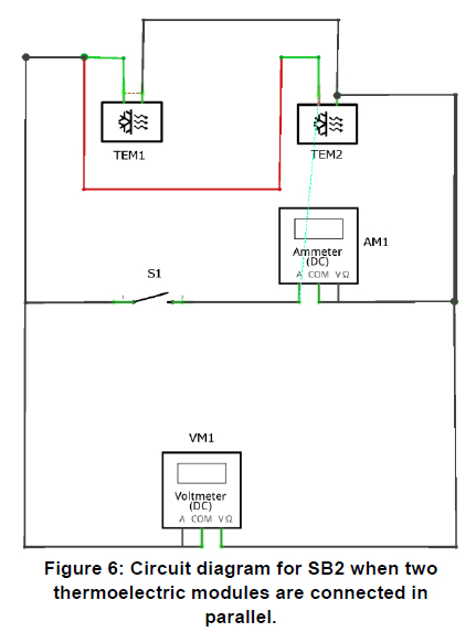 However, for the series and parallel arrangements of TEMs, the circuits displayed in Figures 5 and 6 were wired and connected using 0.34mm solid wire, terminal blocks for nodes, alligator clips and a large push-button switch. Four UNI-T UT33+ series palm-size digital multimeters were used to measure voltage and current readings generated by the TEG.