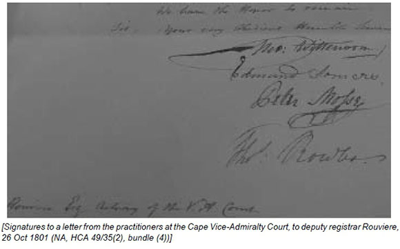 There were never many practitioners at the Cape Vice-Admiralty Court. In October 1801, for instance, there were only four - Wittenoom, Mosse, Rowles and Somers - when they collectively sent a letter to the deputy registrar, Rouviere, objecting to the possibility that the fees in Instance causes would no longer be permitted to be charged at the same rate as those in Prize causes.247