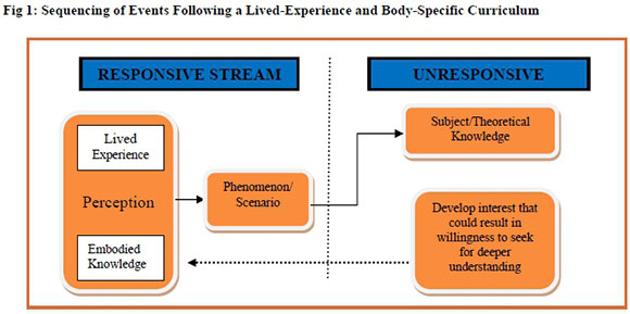 This paper calls for a lived-experience and body-specific curriculum embedded philosophically within existential phenomenology. Existential phenomenology as a theory is not about knowing, but about doing and being. Within the context of curriculum theory, it furthermore offers a way of connecting lived experience and embodied knowledge with the foci of the different disciplinary fields. The model presented (Figure 1) offers an explanation for the processing of experience. Each experiential event represents a new view of the world through experience. If the sensory modalities do not carry information about the event, the memory does not register it, rendering the learner incapable of making a cognitive leap. Conversely, if the responsive stream is activated, the experience becomes the object of consciousness which can be used as a hook to attach disciplinary knowledge. In so doing, the learner rises to a higher level of understanding that creates a deeper state of awareness between the learner and his or her surroundings. However, it is important to take into account the constant changes in society and thus that the theoretical lenses with which we view the world also need to be adjusted, not only in our personal worlds, but also in our institutions of learning.