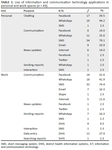 The HSAs were asked to indicate the purposes they accomplished using ICTs in both their personal and work spaces. The purpose was to identify the relationship between the respondents' use of ICTs in personal space and work space. Findings are presented in Table 3. As can be observed in Table 3, in general, HSAs used these applications for chatting with friends, communicating, interacting with friends, for data entry, sending reports, searching health information reports and reading news. Despite Jimoh et al. (2012) report that the mobile sector has satisfactorily flourished in most part of sub-Saharan Africa, our study shows that use of some ICTs such as Twitter amongst HSAs is still low in Malawi. The study revealed that SMS, Facebook and WhatsApp are the most used applications in personal work space. Despite prior reports that penetration of smartphones has tremendously contributed to awareness of some web-dependent technologies such as Facebook and WhatsApp in Malawi (see Chawinga & Zinn 2015; Chawinga & Zozie 2016), the study showed that some web-based technologies such as Twitter are not used by HSAs. The study revealed further that web-based applications, such as Facebook and WhatsApp, which HSAs are competent in using, are used to accomplish work-related activities on a very small scale. This is attributed to the fact that social networks are commonly perceived to be used for informal communication and discourage HSAs to use them for formal work purposes.