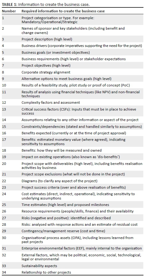Information to create the business case is itemised in Table 1.