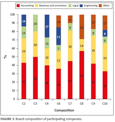 It is evident from Figure 3 that more chartered accountants than other professions serve these 10 boards, making up to 57% in one case. From the literature, board decisions on IT-related investments focus more on accessing IT investments based on the financial returns (ROI) and the cost savings achieved from such investments.